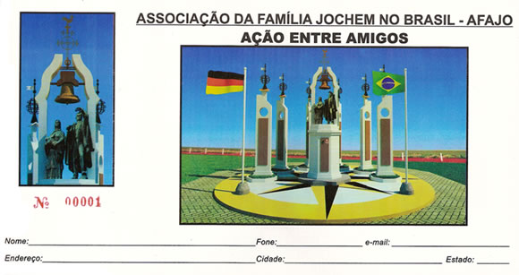 Desta forma, a Diretoria elaborou uma “Ação Entre Amigos”, cujos blocos serão distribuídos para cada família Jochem no Brasil. O ideal é que cada família ou simpatizante se responsabilize pela compra ou venda de um bloco. A história da família Jochem é um bem comum, e está sob a responsabilidade de todos nós. O alvo principal dessa iniciativa é a construção do Memorial da Família Jochem , no lote de terras adquirido pela AFAJO, em Löffelscheidt (Águas Mornas – SC), local onde se estabeleceu, em 1847, o casal imigrante Pedro Jochem e Anna Maria Petri. A pedra fundamental do referido memorial foi lançada a 04 de setembro de 2006.